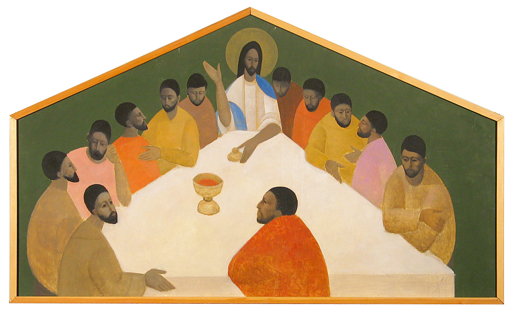 Veikko Marttinen, Ehtoollisen asettaminen, öljyväri kovalevylle, 95,5 x 142,5 cm. ( kuva © Suomen ortodoksinen kirkkomuseo) Kuva Keski-Suomen museon näyttelystä: Jälleenrakennuskauden ikonit, 21.3. - 19.4.2009